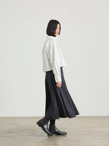 This flared skirt features beautiful drapes from the hips to the hem thanks to panel switching. It exudes a classic mood this fall and winter. The longer length gives a sense of calm and security to the sophisticated woman's look. The silhouette is simple and modern.