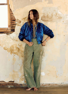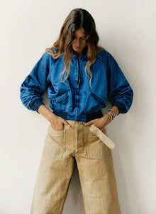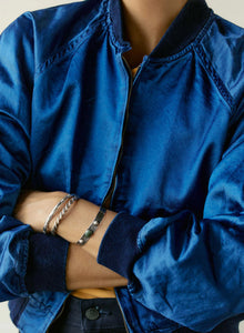 each jacket is sewn from a lightweight washed indigo Japanese satin fabric that's finished off a yarn-dyed indigo rib.