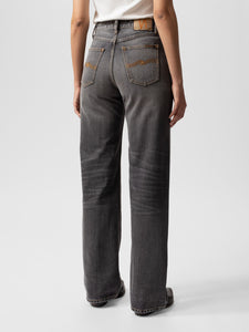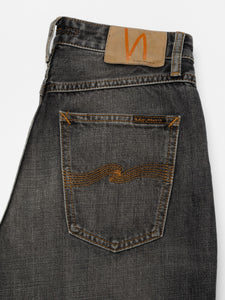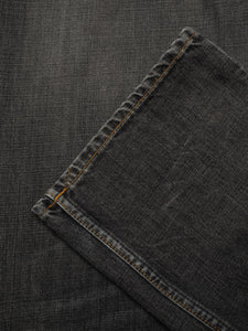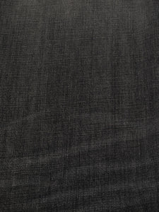 High-waist, loose-fit jeans featuring a bold grey wash and contrasting details. Crafted from black denim with a rugged crosshatch texture, these jeans highlight rich highs and lows, accentuated by a pronounced slub character. Abrasions and sharp wear marks deepen their unique, bold, and monochromatic look.