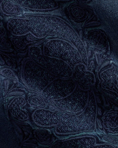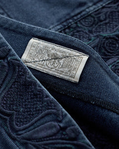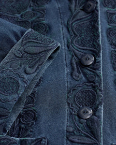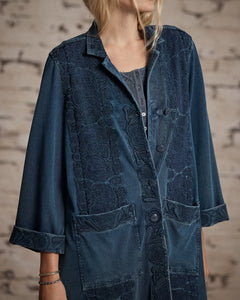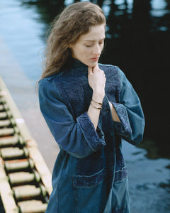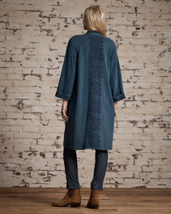 Duster jacket made with cotton jersey that is yarn-dyed with true indigo. Embroidery motifs and techniques are inspired by a 19th-century French garment. Corozo buttons.